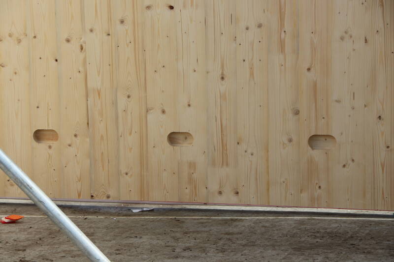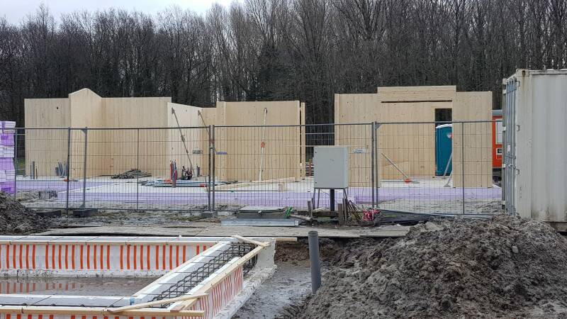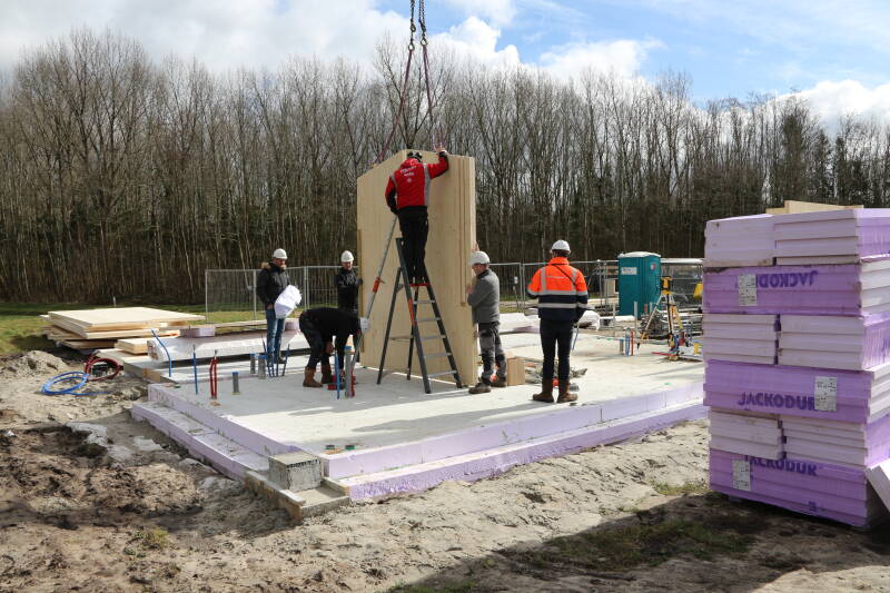 Elke keer als we de bouwplaats bezoeken merken we, behalve de gestage vorderingen, ook het enthousiasme van zowel de bouwers als geïnteresseerde omwonenden. Erg leuk om te zien! Inmiddels is er weer een nieuwe stap zichtbaar, doordat deze week de panelen voor de muren zijn gearriveerd. Deze CLT panelen zijn vooraf in de fabriek gemaakt (prefab) en gaan als een kant en klaar "pakketje" naar de bouwplaats. Hier worden ze neergezet en passend voor de volgende verdieping gemaakt. Zoals we al eerder schreven, zorgt deze manier van bouwen voor een aanzienlijk kortere bouwtijd. De elementen voor de benedenverdieping staan er inmiddels, zowel voor de buiten- als de binnenmuren, alle vertrekken zijn zichtbaar. Volgende week is de bovenverdieping aan de beurt, zodat volgens planning het hele huis er staat op 26 maart!