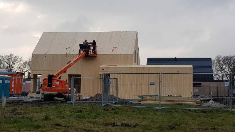 Op 5 februari plaatsten we de eerste foto op deze website, met als bijschrift; 'De contouren zijn al zichtbaar'. Het is nu, op het moment van schrijven, exact 7 weken verder. 26 maart geeft de kalender aan en ondanks de bouwstop in februari, vanwege de vorst- en sneeuw, kunnen we vandaag een mijlpaal melden. Het hoogste punt is bereikt en zelfs het dak zit er al op. En dat betekent volgens traditie een klein feestje op de bouw, waarbij de vlag in top gaat!